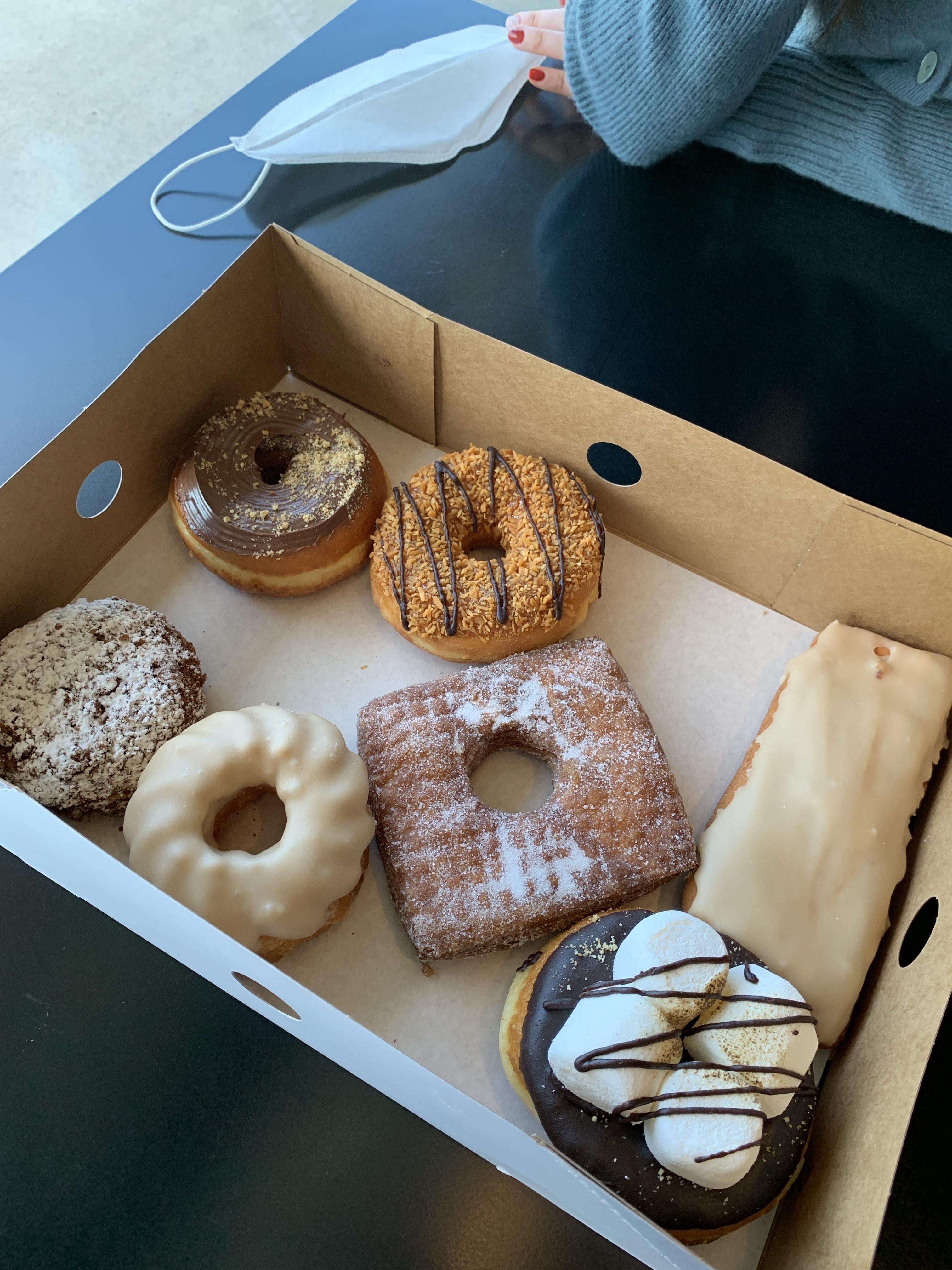 도넛을 여러개 박스에 담아 전망 좋은 2층에 있는 카페에서 커피와 함께 즐겼다.